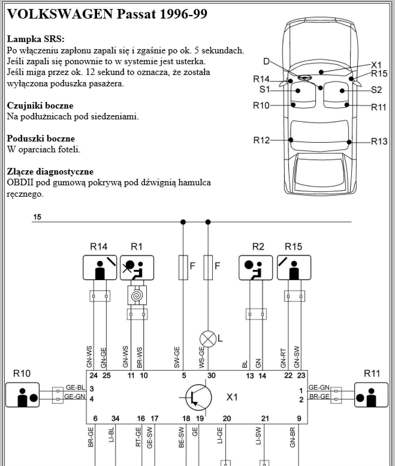 Program Schematiq Location Airbag Blocks is an educational reference for locating airbag control units and reading basic SRS schematics on older vehicles. It was created as training material by a Polish automotive training centre and focuses on passenger cars from the mid-1990s to early 2000s. Each model sheet shows where airbag modules, crash sensors and connectors are mounted and gives a simplified wiring diagram of the SRS system.