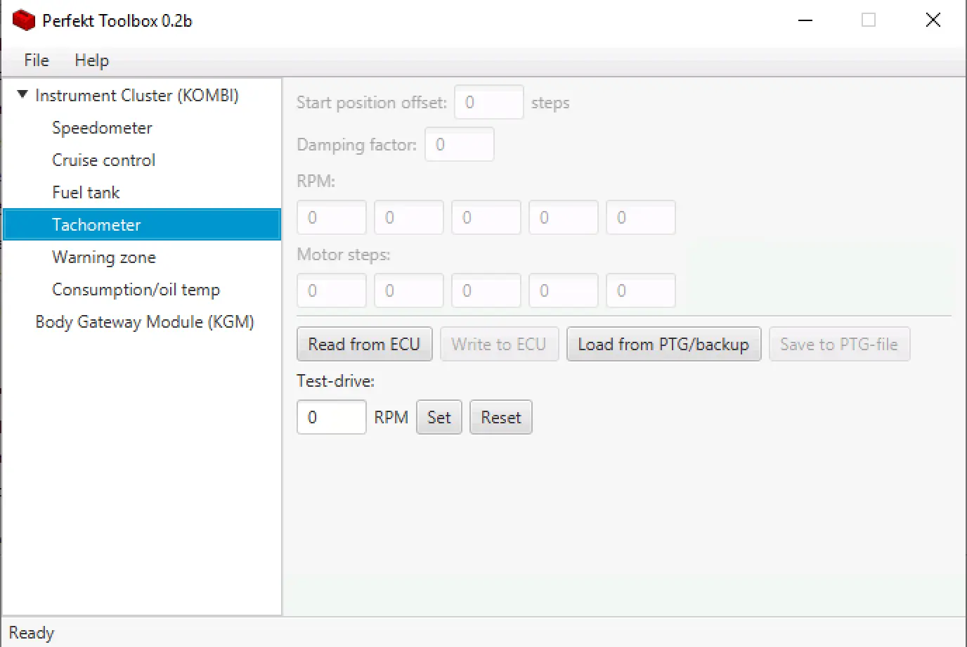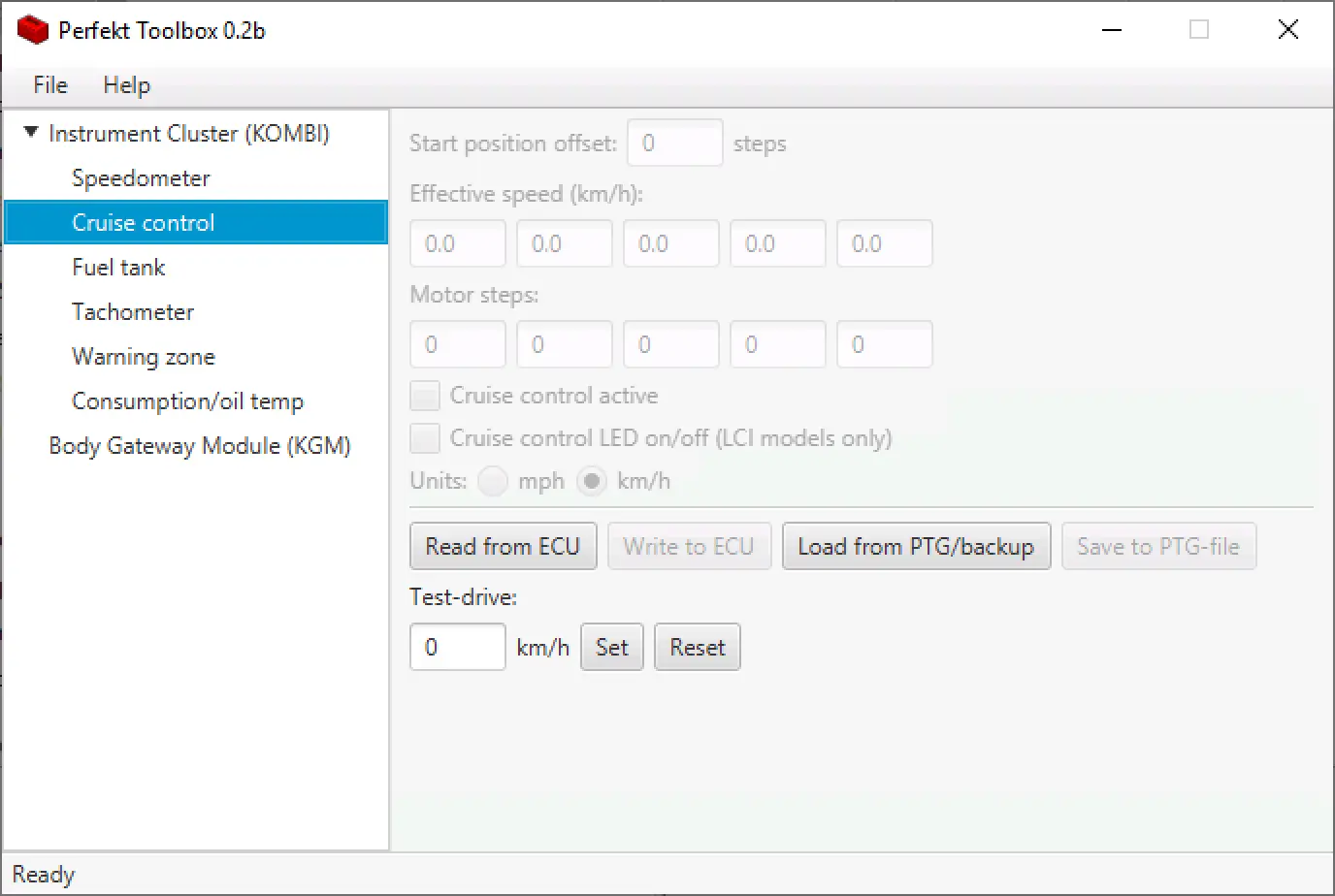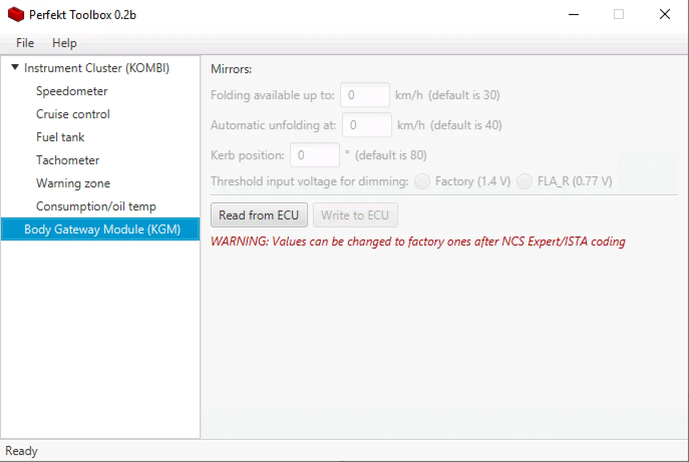 Perfekt Toolbox is a lightweight utility for BMW E6x/E7x/E8x/E9x platforms that reads, tests and adjusts KOMBI instrument cluster parameters and selected Body Gateway Module (KGM) options. It focuses on safe calibration edits and service checks within the cluster domain.