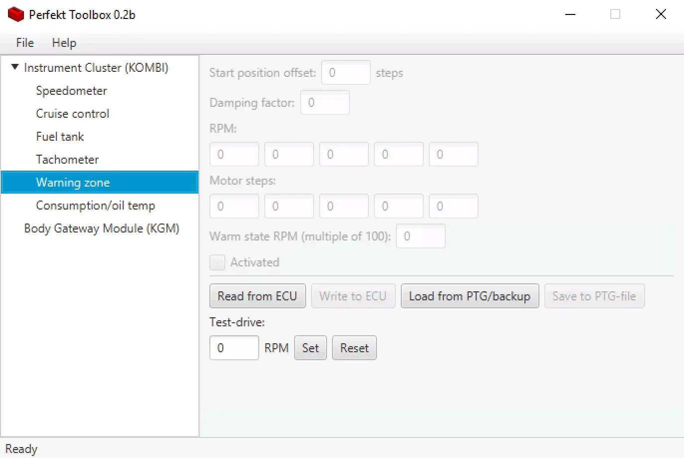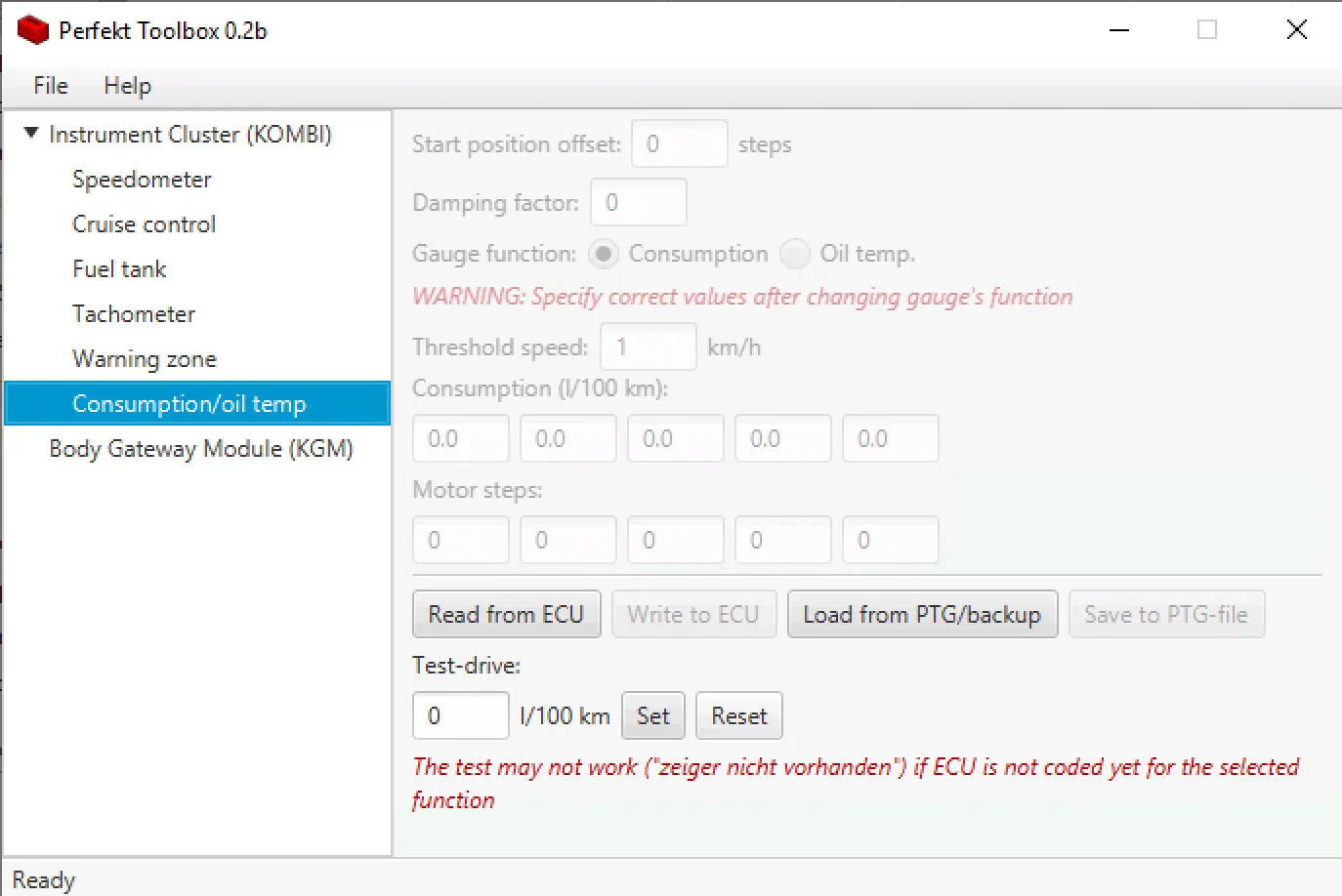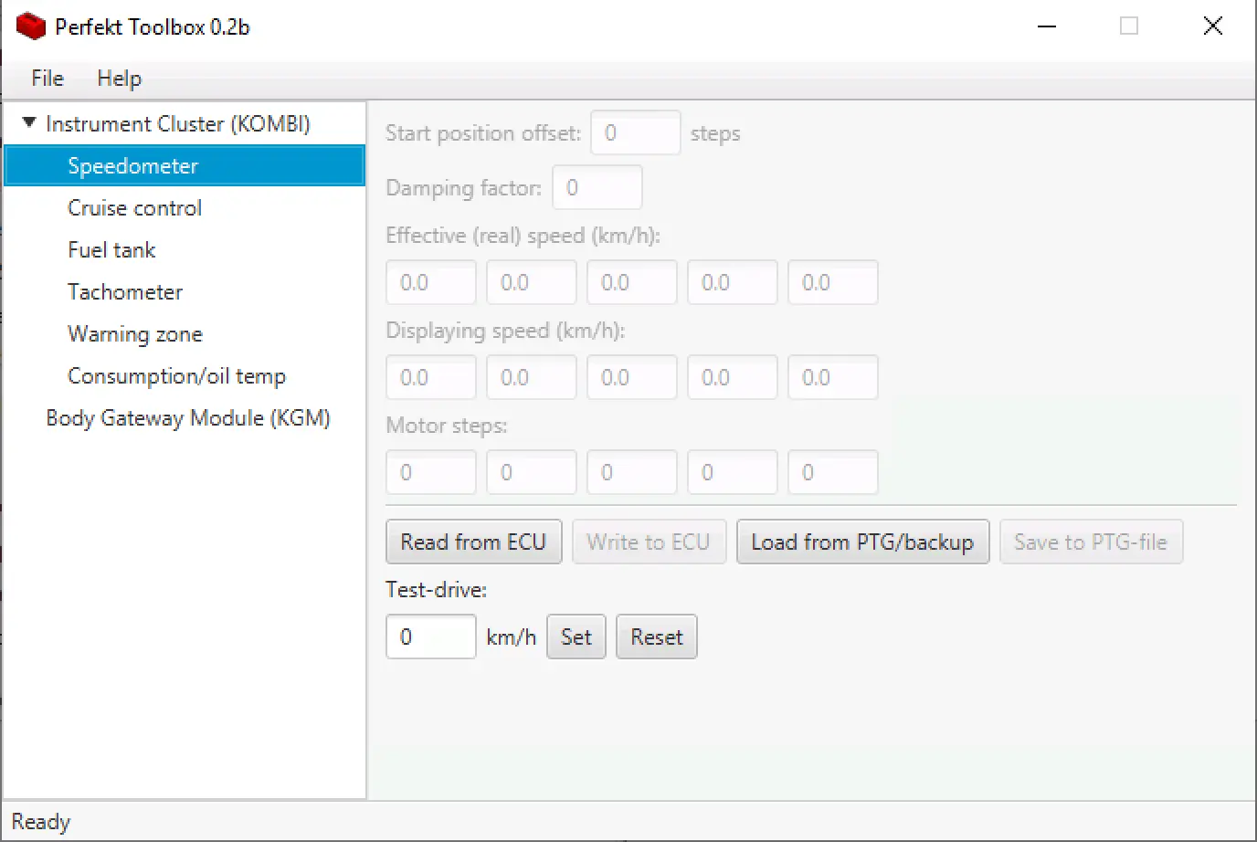 Perfekt Toolbox is a lightweight utility for BMW E6x/E7x/E8x/E9x platforms that reads, tests and adjusts KOMBI instrument cluster parameters and selected Body Gateway Module (KGM) options. It focuses on safe calibration edits and service checks within the cluster domain.