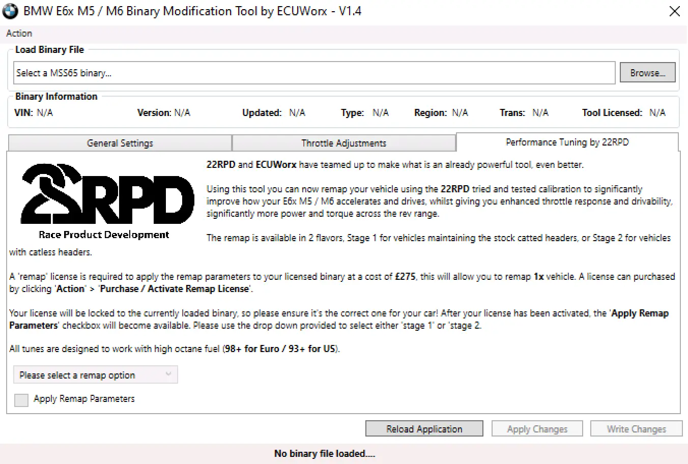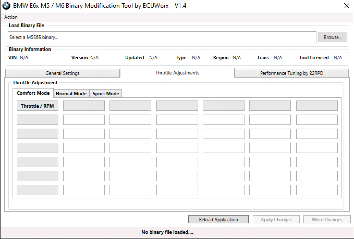 MSS65 Binary Modification Tool is a Windows desktop utility built for file based calibration changes on the BMW MSS65 DME used with the S85 V10 platform. It is intended for working with saved binary files that were previously read from the ECU, then writing an updated file after parameter changes are applied.
