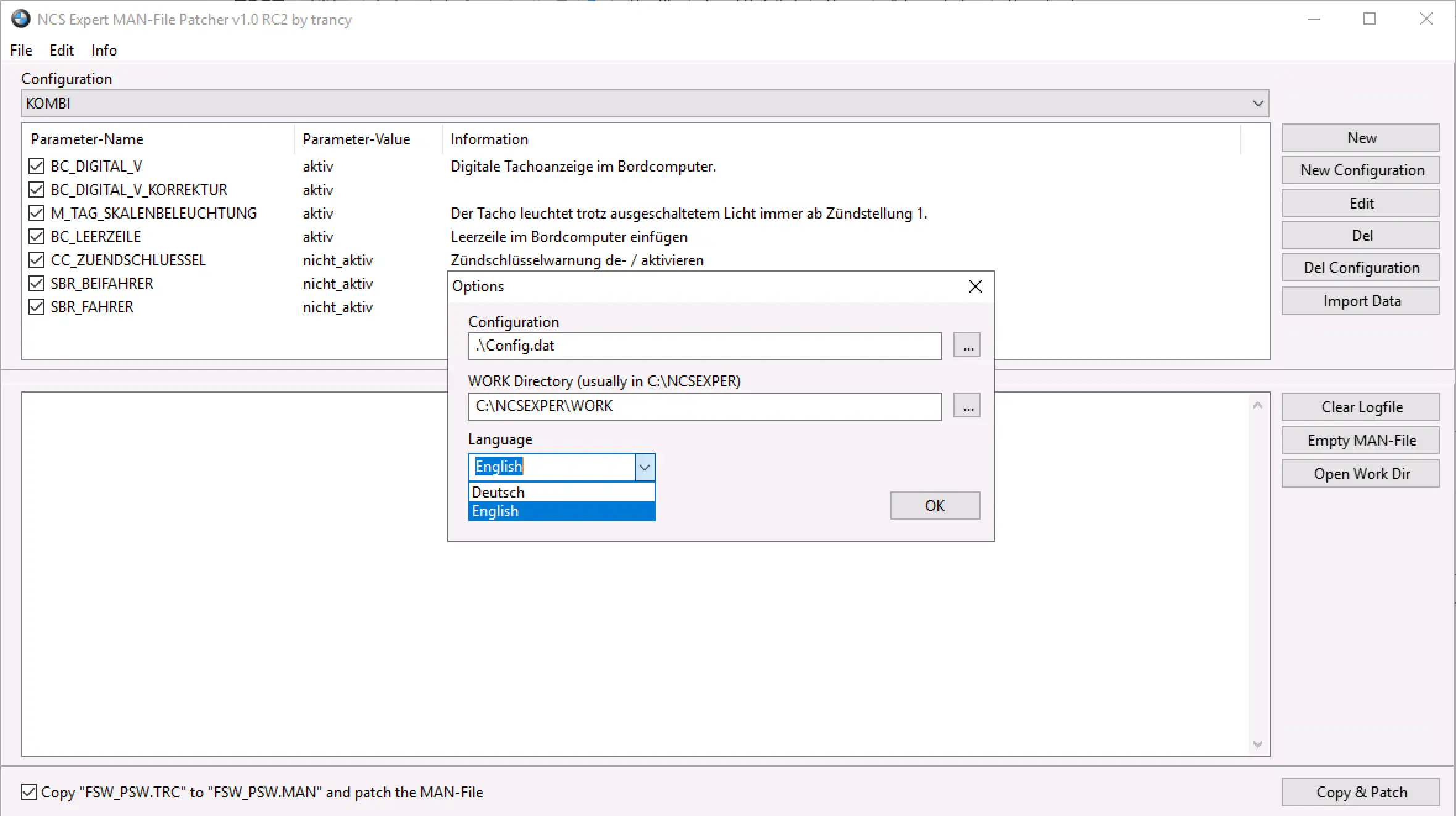 This MAN file coding utility is intended for use together with BMW NCS Expert and an existing EDIABAS installation. It is not a replacement for NCS Expert or NCS Dummy but a helper that prepares FSW_PSW.MAN files before they are written back to the vehicle. Available parameters depend on the configuration data supplied in Config.dat and data.ini which are focused on common E series modules. Some newer control units or rare options might not be listed and still require manual editing or a full NCS Dummy setup.