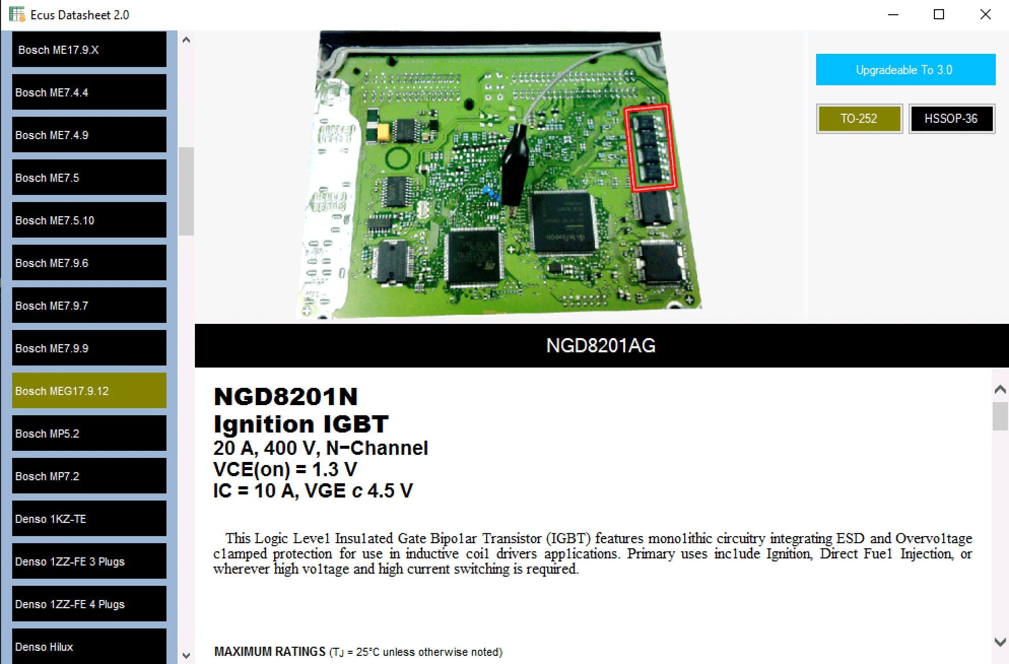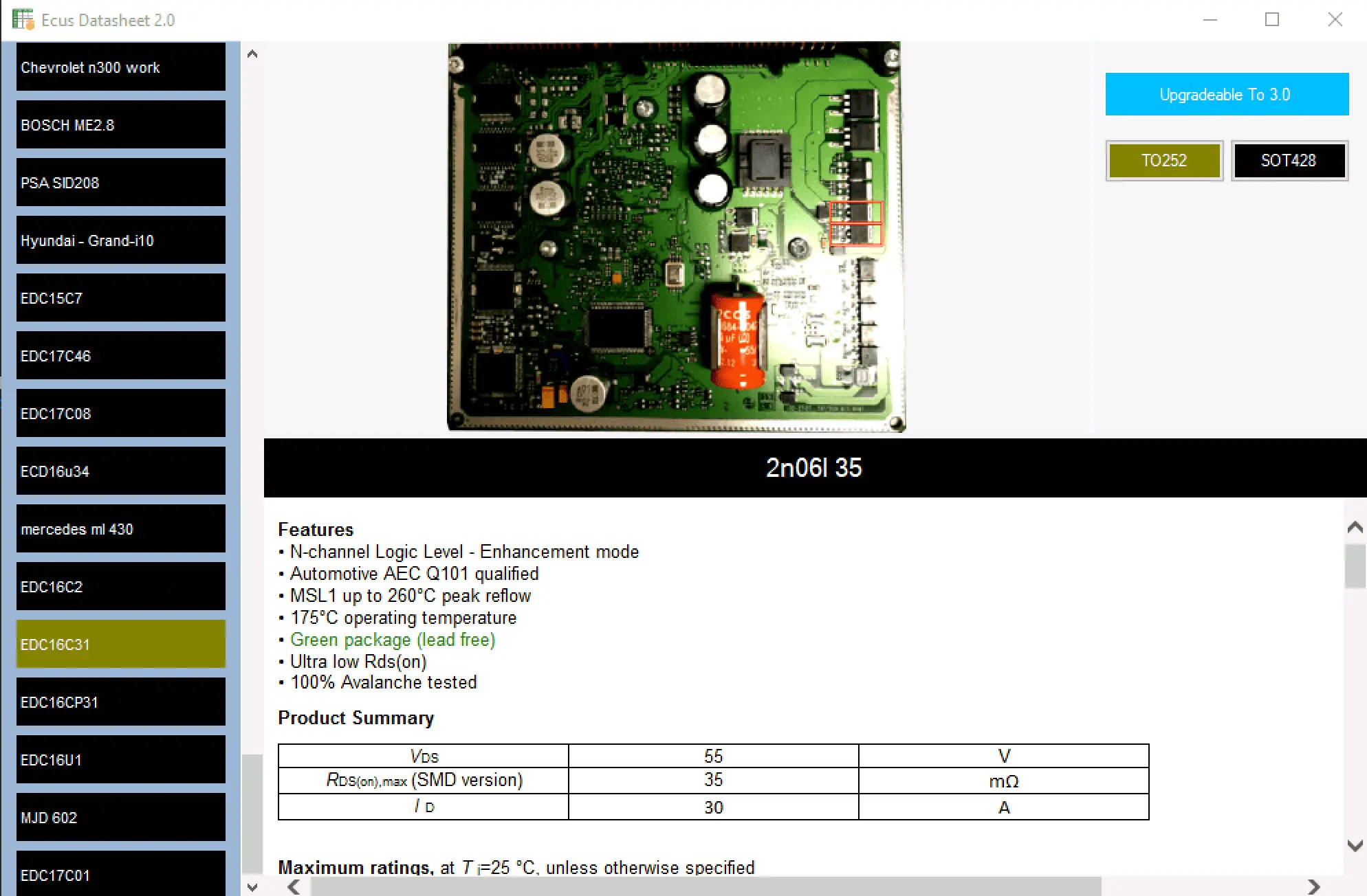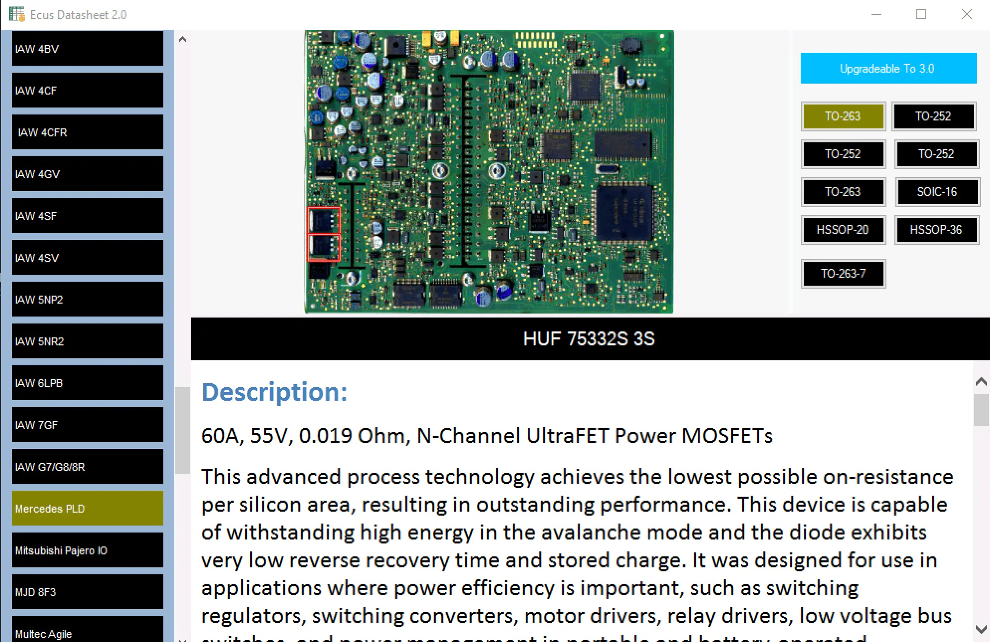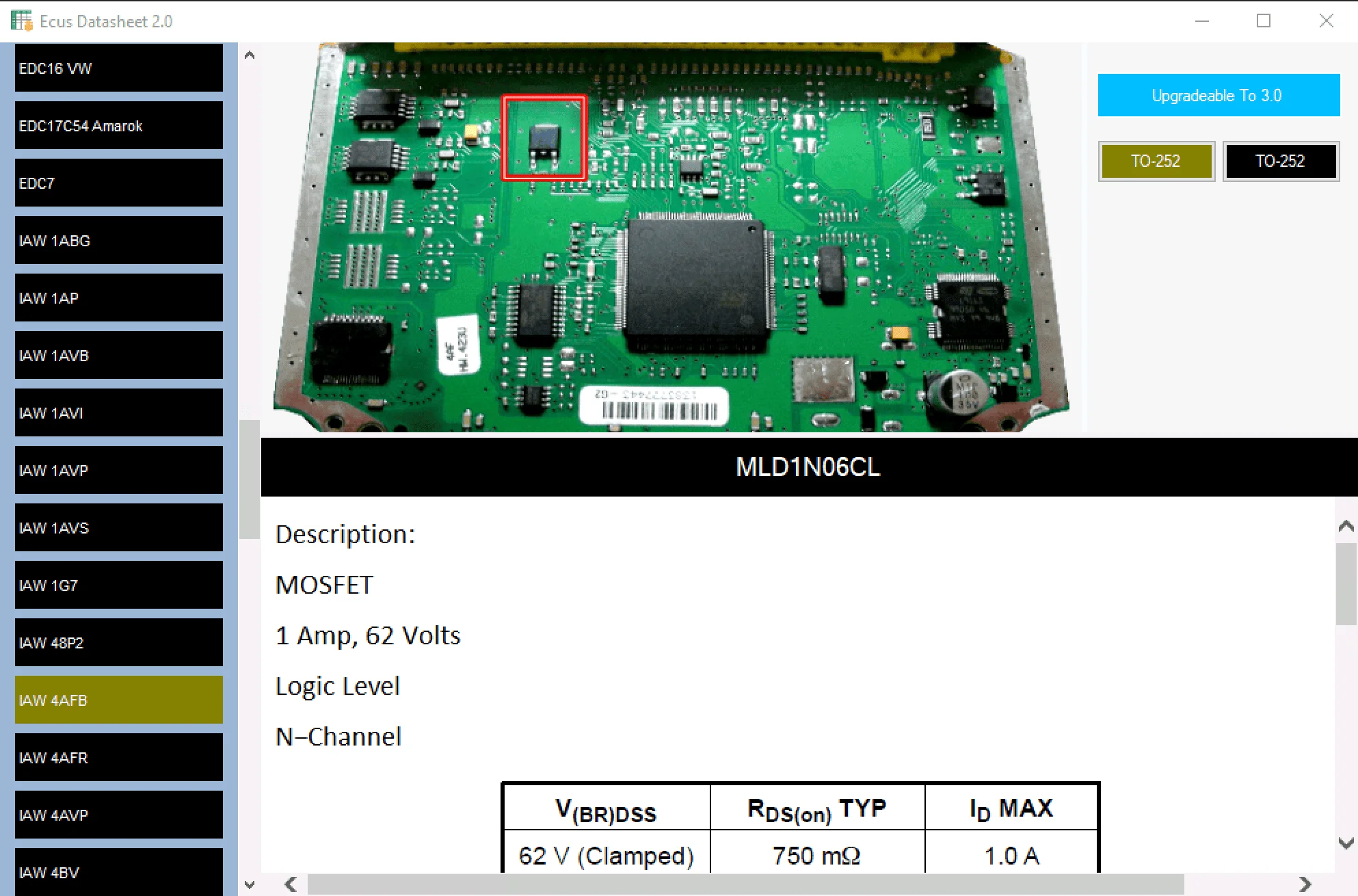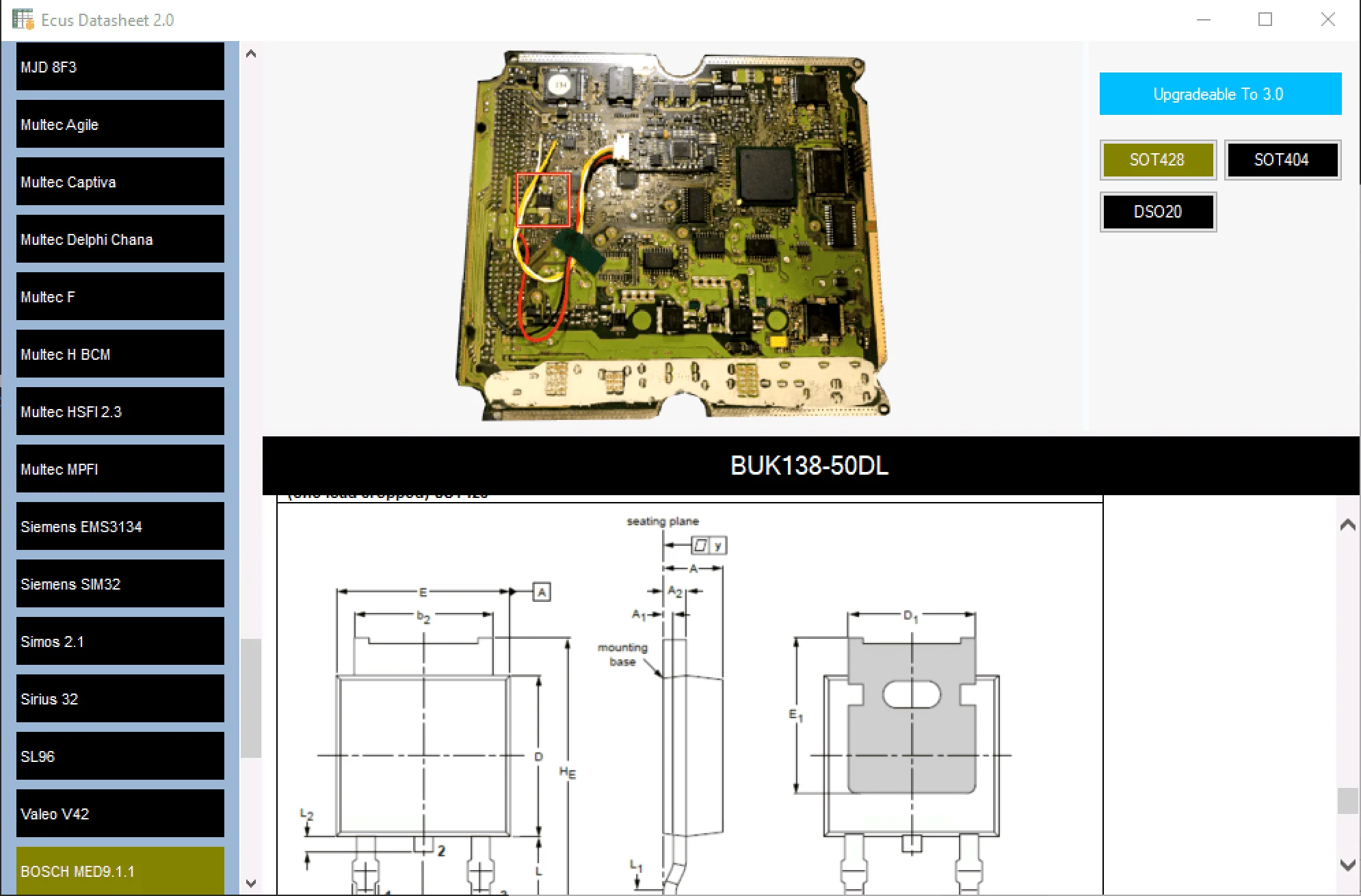 ECUs Datasheet 2.0 is an offline reference viewer for electronics repair on automotive ECUs. It helps bench technicians quickly locate components on real board photos and open the matching datasheet with package and pinout details.
