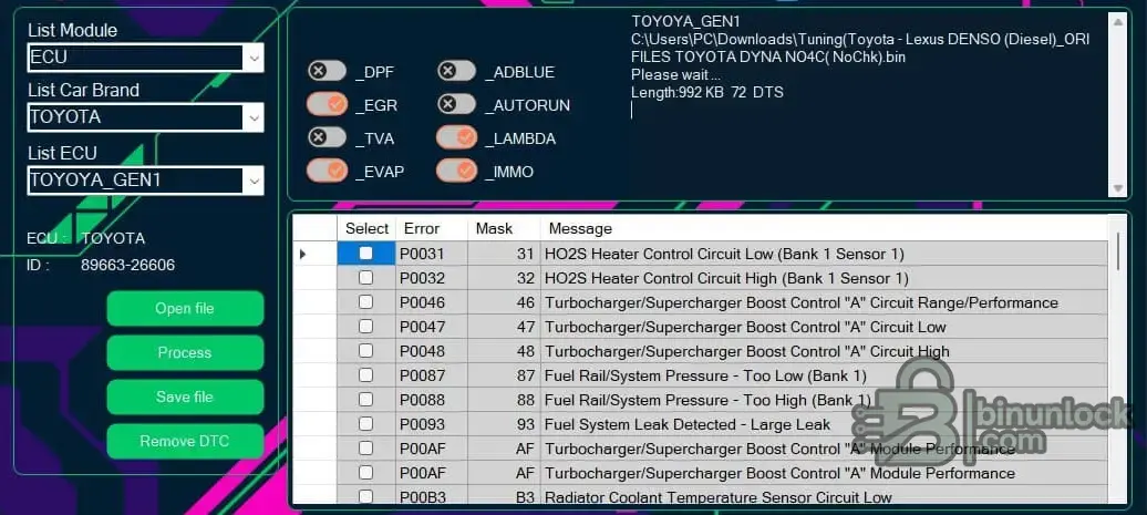 ECU Tuning Solutions is an offline ECU file utility designed for professional workshop workflows. Users can load supported ECU files, run processing routines, review built-in DTC tables, and export updated files.
