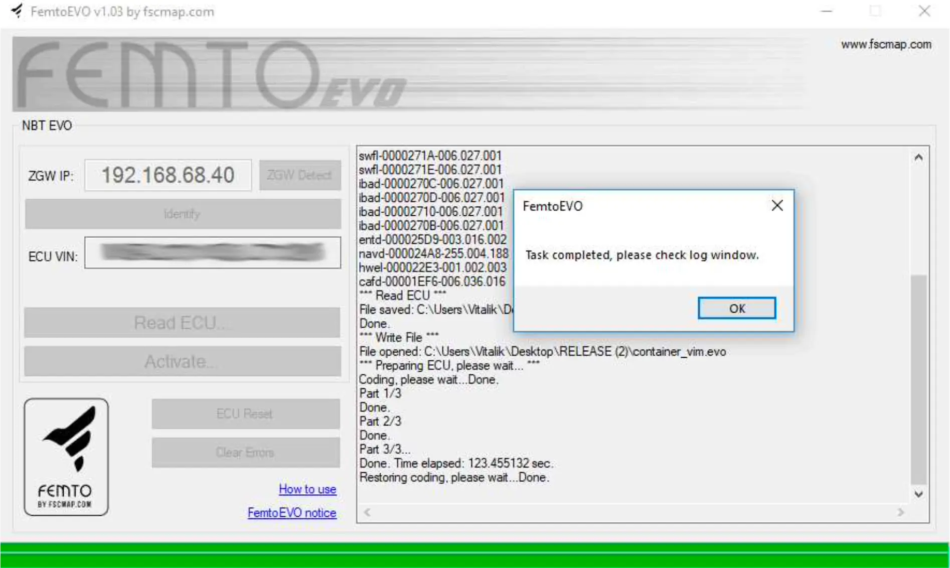 - Launch FemtoEVO, enter or detect the ZGW IP, then read the ECU VIN and head unit status.