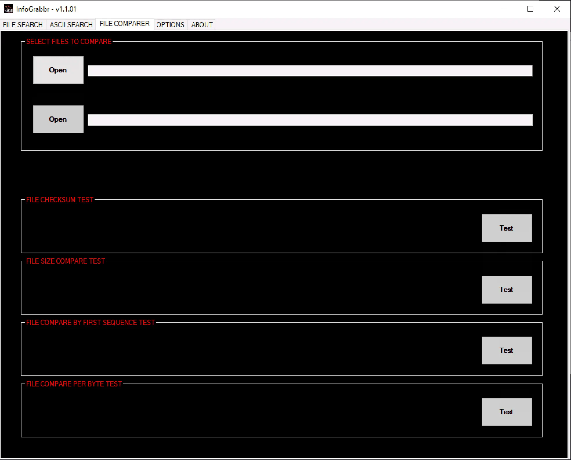 - File Comparer supports checksum test, file size test, first sequence match and per-byte diff