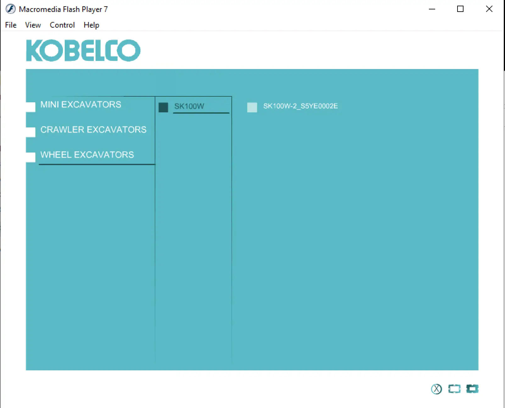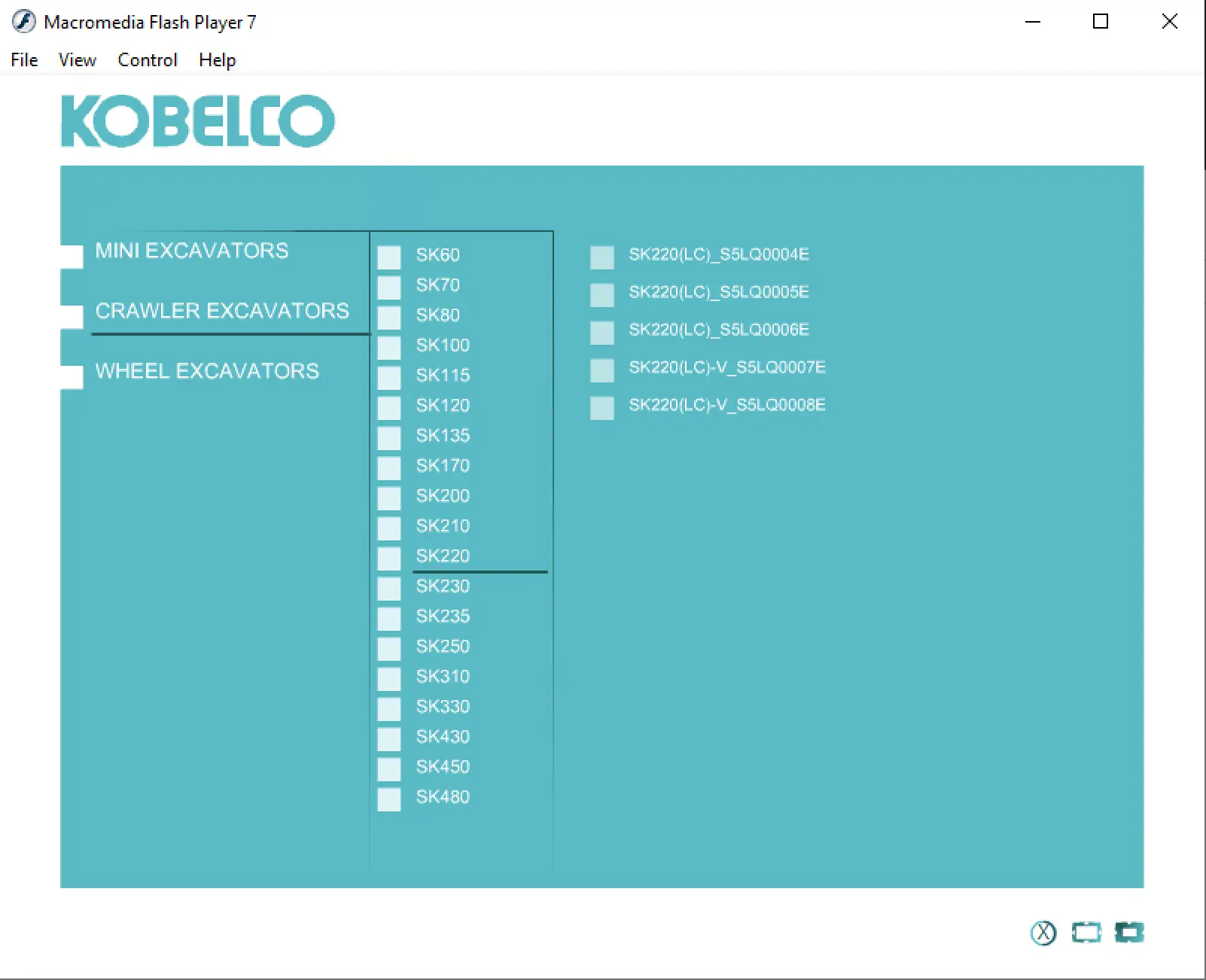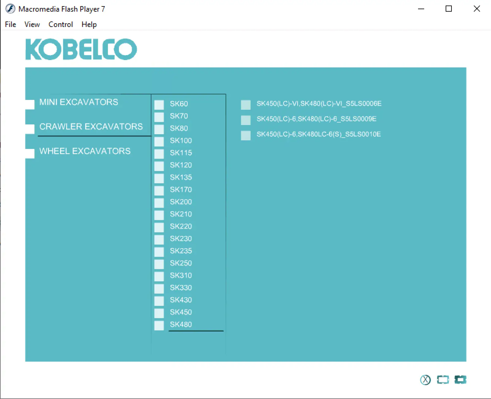 - Interactive model selection for Kobelco MINI EXCAVATORS, CRAWLER EXCAVATORS, and WHEEL EXCAVATORS