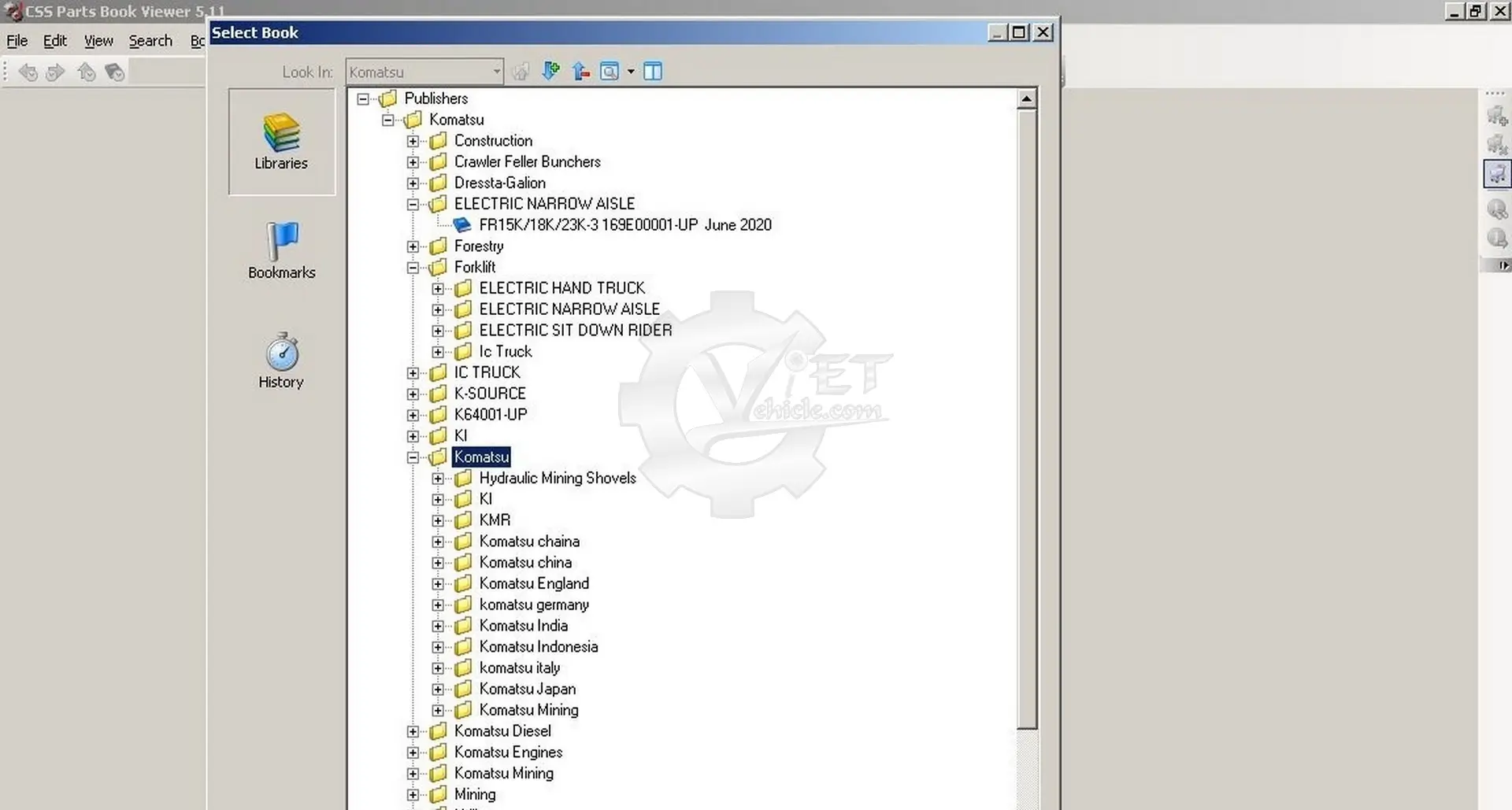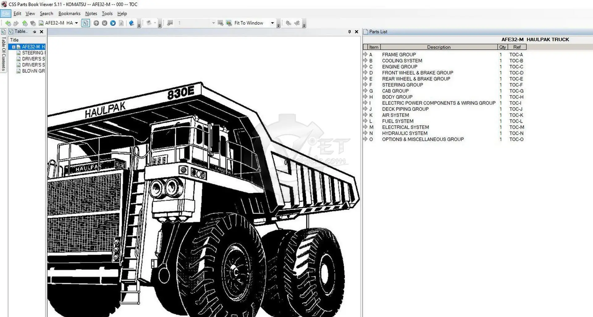 CSS Parts Book Viewer v5.11 showing EX50 parts manual cover and table of contents navigation.CSS Parts Book Viewer v5.11 displaying Komatsu mining catalog sections and parts list panel.CSS Parts Book Viewer v5.11 showing Haulpak 830E catalog with component group table of contents.CSS Parts Book Viewer v5.11 book selection tree with Komatsu construction, forklift, and mining libraries.