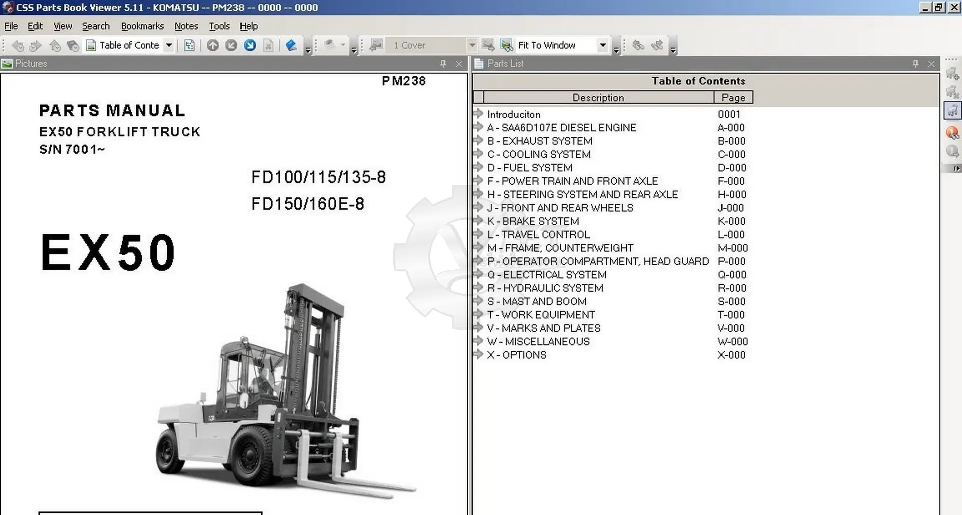 Komatsu LinkOne CSS Parts Book Viewer is a desktop parts catalog viewer used with CSS-NET EPC data. It helps technicians navigate parts manuals, exploded illustrations, and structured contents lists to identify assemblies and service parts for Komatsu equipment.