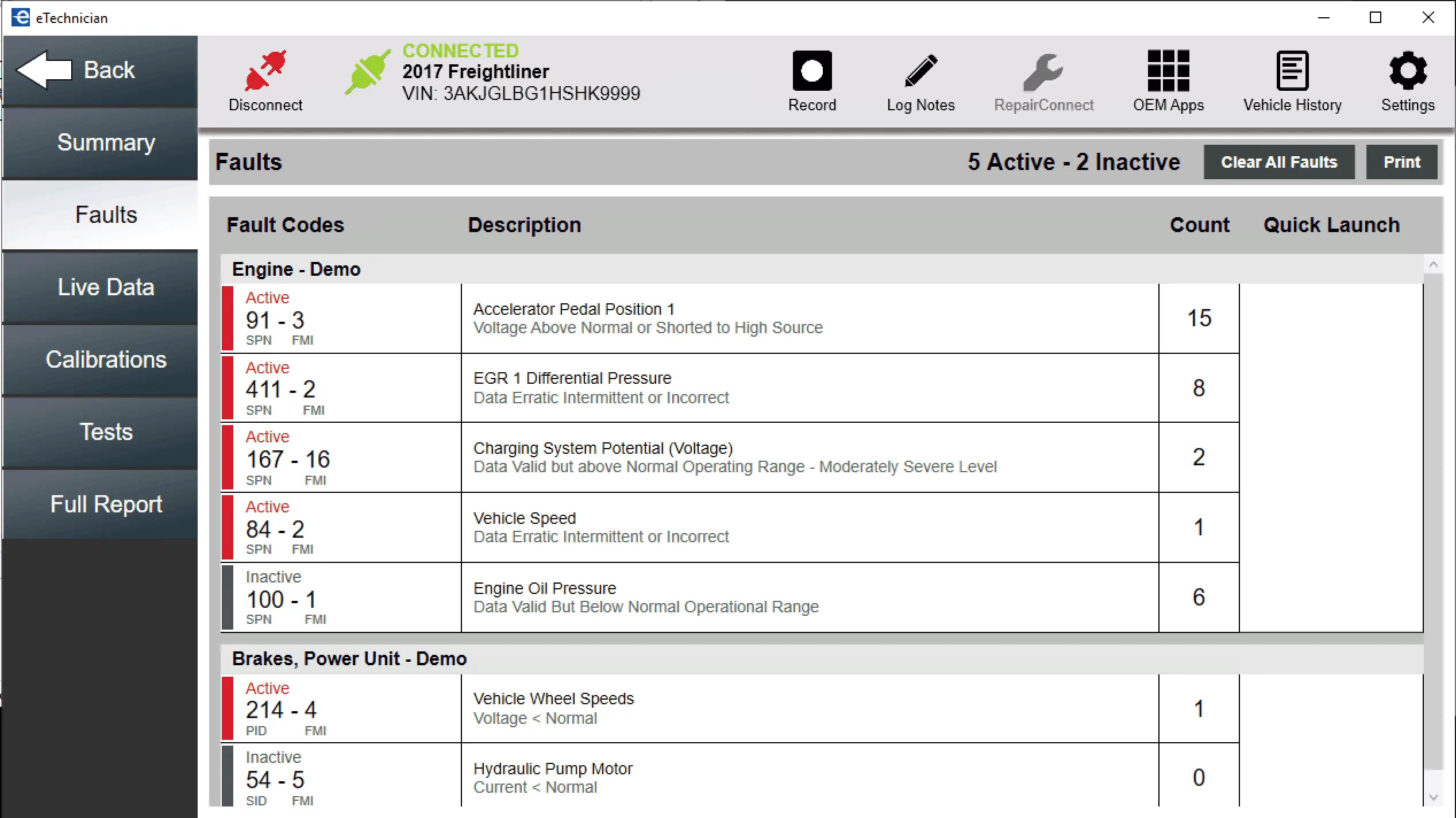 - Fault viewer with SPN and FMI plus counts and quick actions
