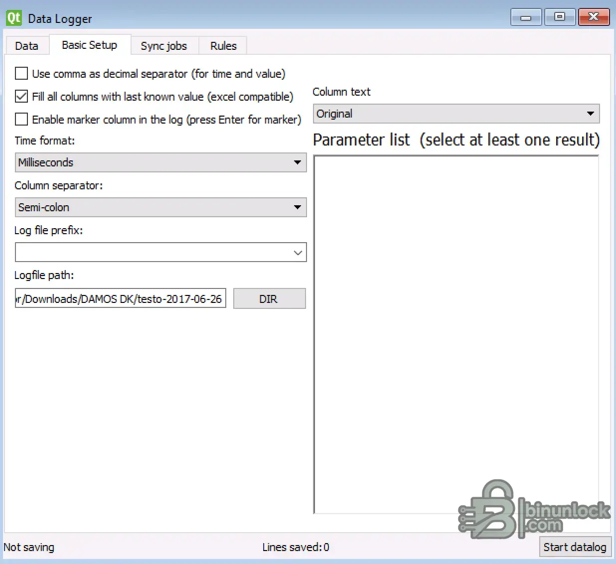 - Open Data Logger, choose delimiter and time format, then select at least one parameter to record.