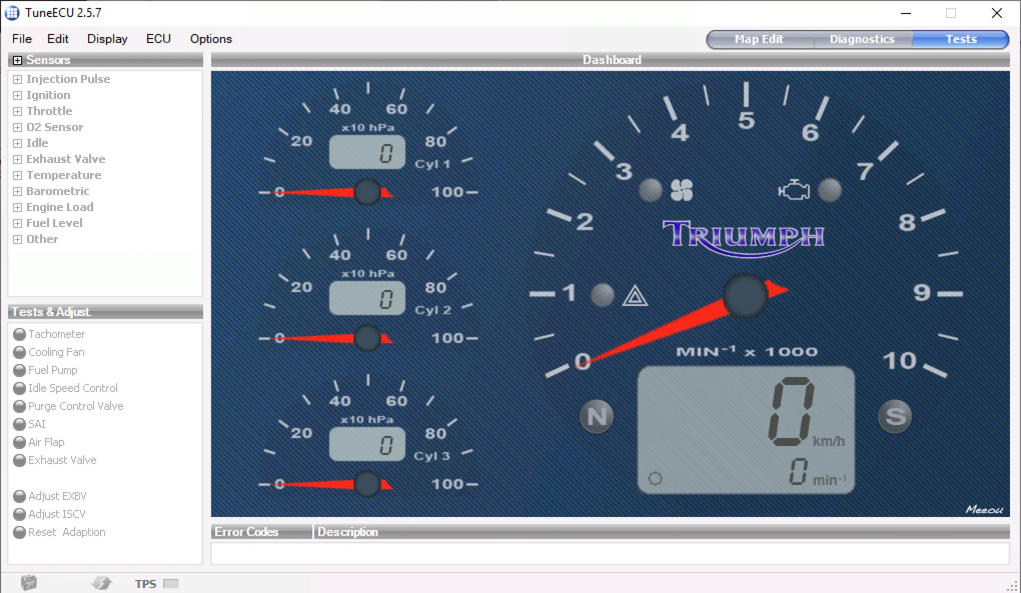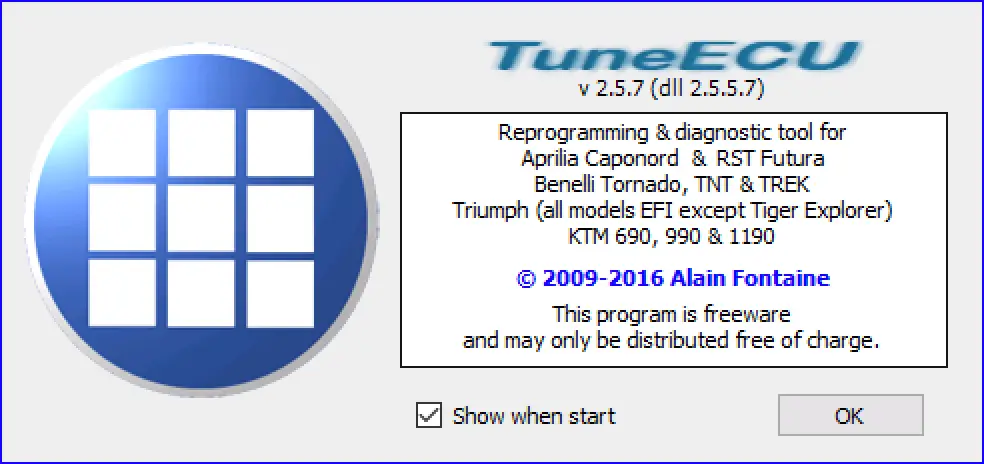 TuneECU 2.5.7 for Windows is a freeware reprogramming and diagnostic tool for engine control units used on many older EFI motorcycles from Triumph, Aprilia, KTM and Benelli. It works with Sagem, Keihin and Walbro ECUs to read and write maps, monitor live sensor data and run workshop-style tests for maintenance or troubleshooting.