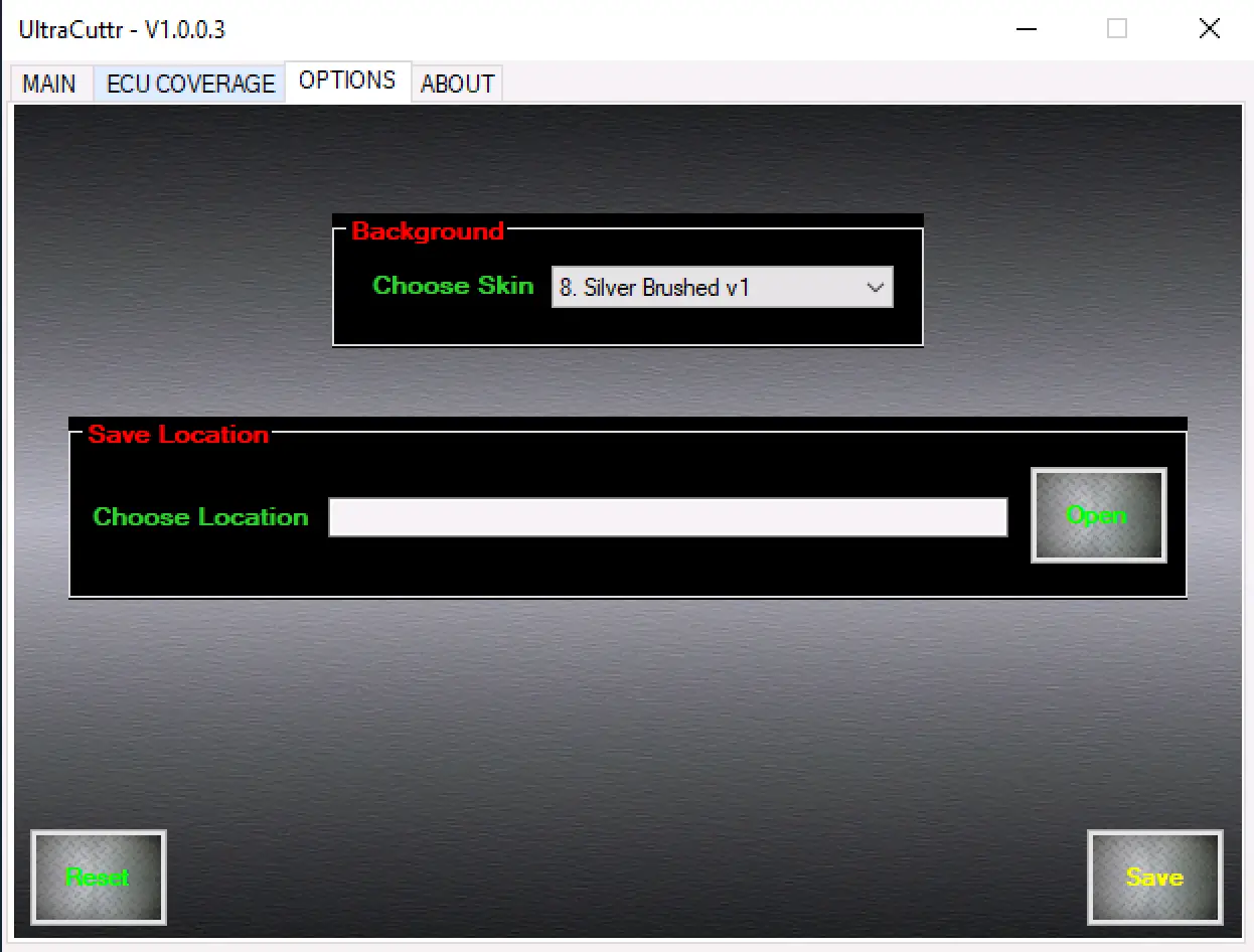 - OPTIONS — UI customization (skin/background) and save-location selection for exports.