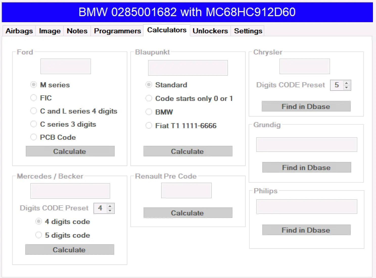 - Calculators: Ford M-series, Blaupunkt (incl. BMW profile), Mercedes/Becker, Renault pre-code, Chrysler, Grundig, Philips