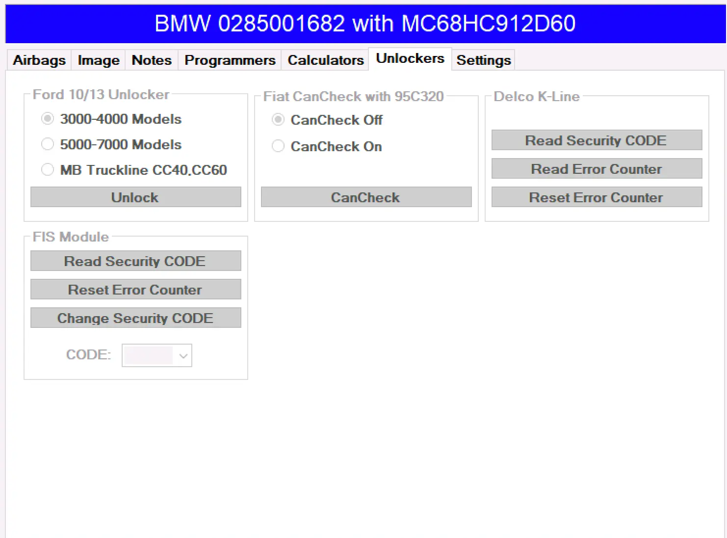 - Unlocker tools: Ford 10/13 series, Fiat CanCheck (95C320), Delco K-Line and FIS module counters