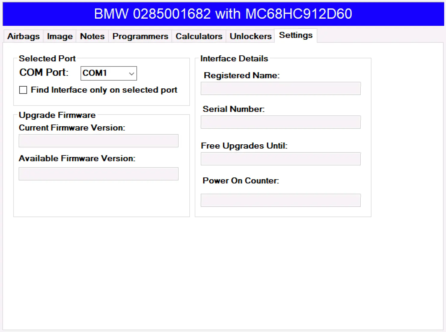 UltraProg is a bench-service toolkit for airbag SRS modules and electronic units. It provides EEPROM and microcontroller access, calculators for popular radio families, and unlocker utilities for service resets. The interface shown targets BMW 0285001682 with MC68HC912D60 and similar units.