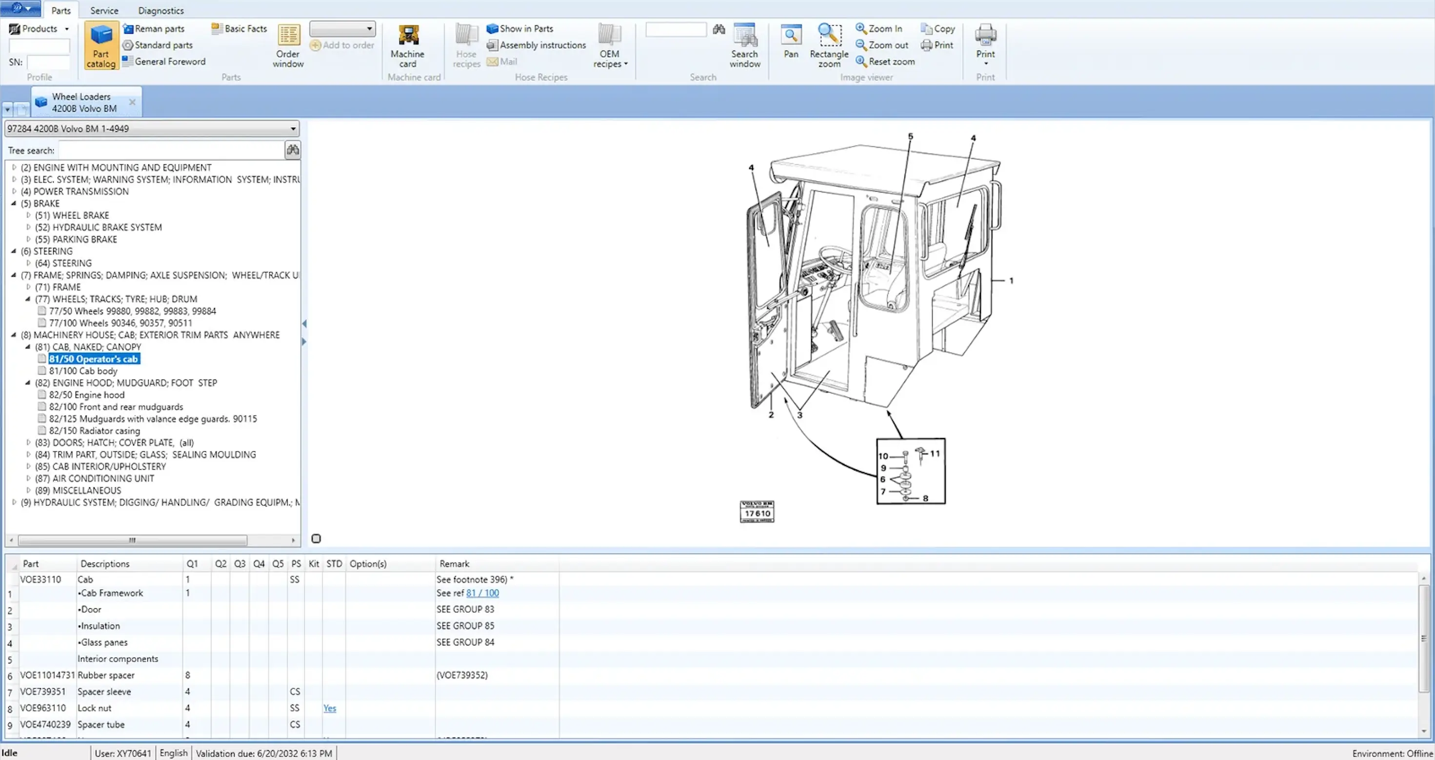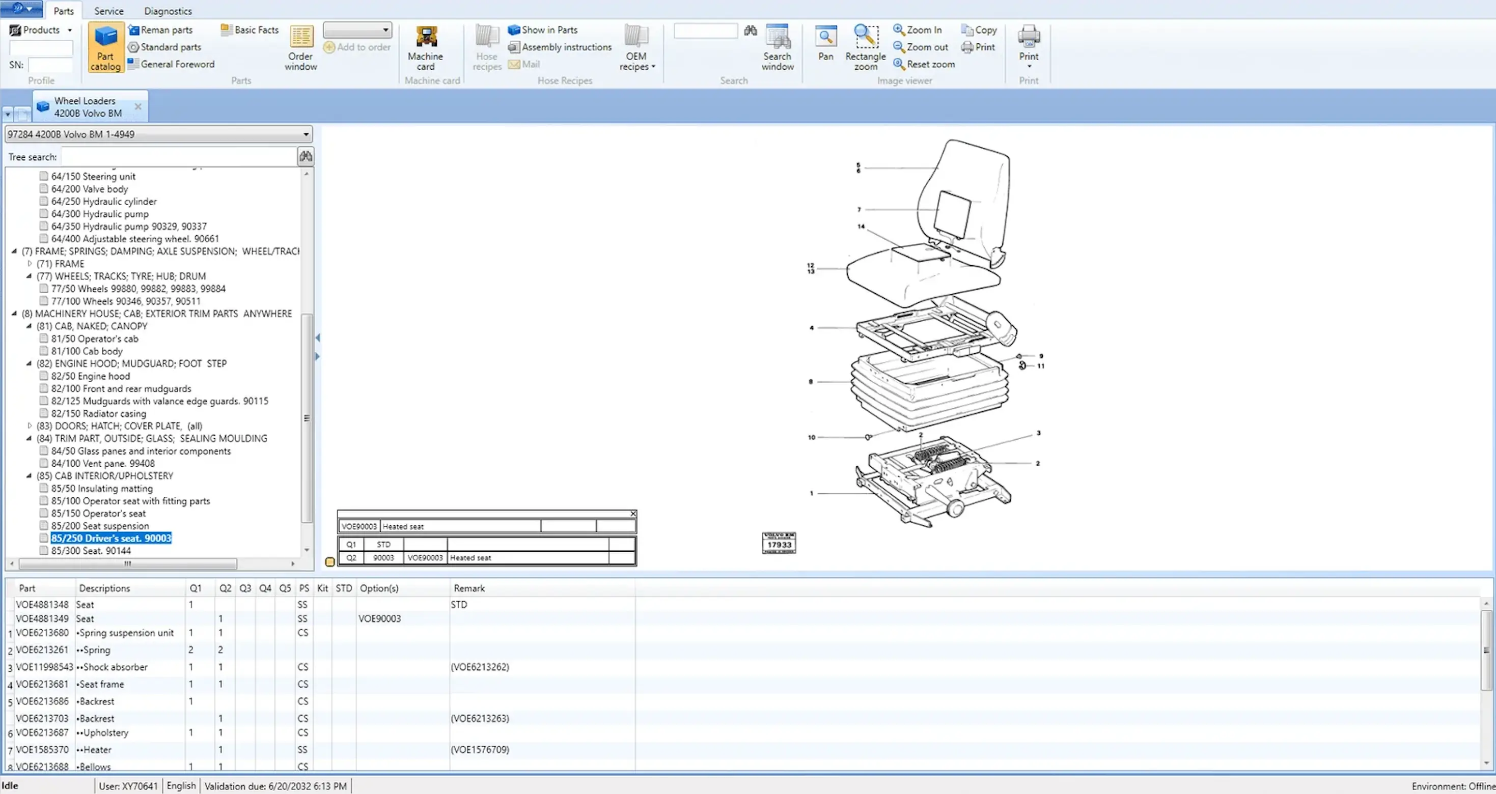 - Navigate by product tree, model, and serial range; filter parts by profile