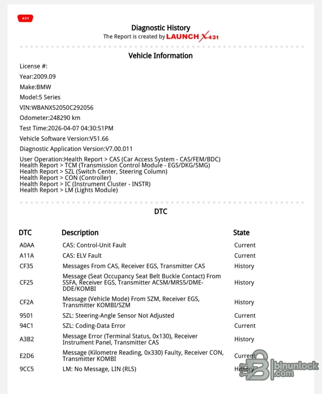 Now I can see the DTCs clearly. Here is the full analysis for your 2009 BMW 5 Series (WBANX52050C292056, 248290 km) with the