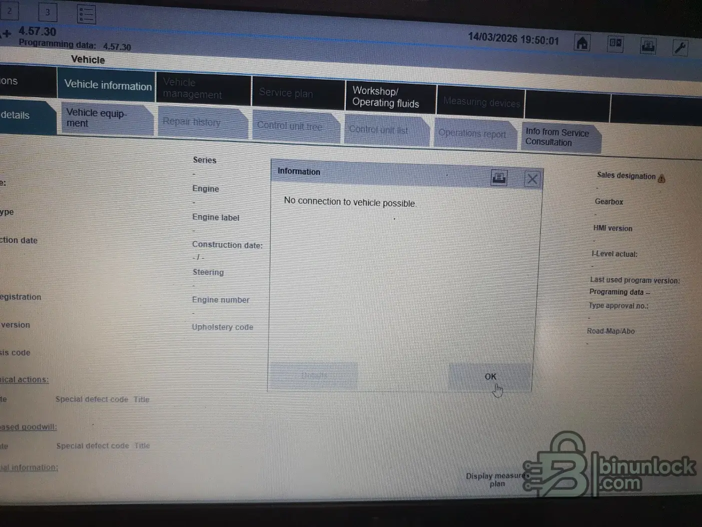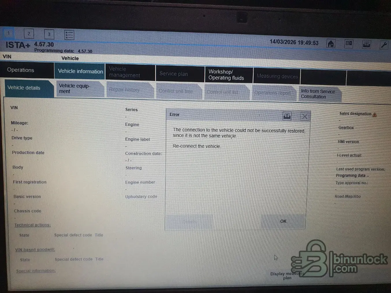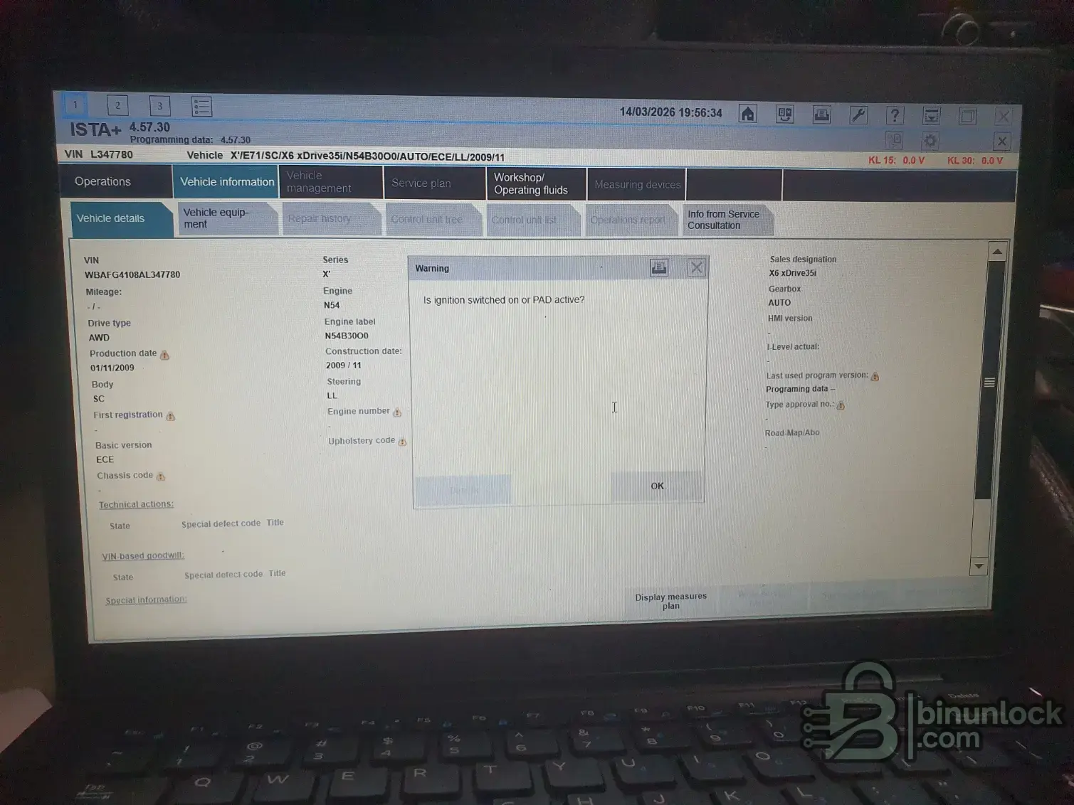 I tried using ICOM next, and the system can read the VIN, but the voltage at KL 15 & KL 30 is showing 0.0V in red, and a pop-up message says (is the switch on or PAD active?). Then the system quit, as shown in the photos. unable to complete scanning ....